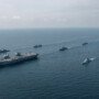 En su tránsito hacia el Mediterráneo, el grupo atravesó el Mar Rojo y el Canal de Suez, realizando una escala en Creta, donde se efectuó el relevo de mando del portaaviones al capitán Ben Power. La agrupación se reforzó además con la fragata italiana ITS Luigi Rizzo, el destructor HMS Dauntless y la fragata HMS Richmond, esta última integrada en ejercicios antisubmarinos junto a la Armada Helénica.